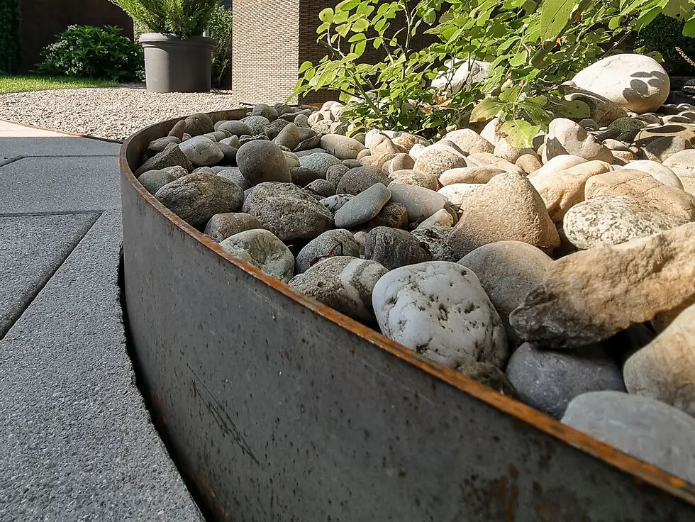 Im Zuge der Umgestaltung wurde ein neuer, leicht erhöhter Sitzplatz realisiert. Die Oberfläche wurde mit einem trittfesten Festkiesbelag ausgeführt, der eine natürliche Optik mit hoher Funktionalität verbindet. Zur klaren Abgrenzung und formalen Fassung der Fläche kam ein umlaufendes Stahlband zum Einsatz, das sowohl als gestalterisches Element als auch zur Stabilisierung des Belags dient.