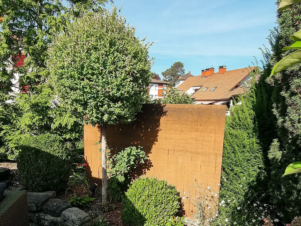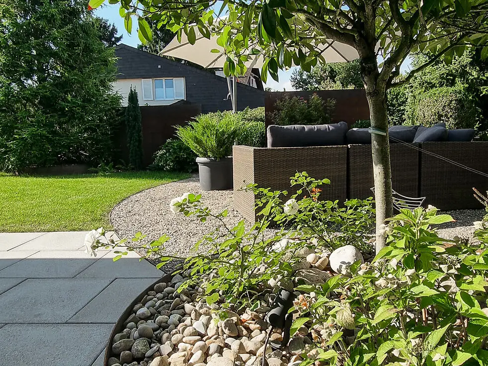Im Rahmen der Umgestaltung entstand ein vielseitiger Aussenraum mit klarer Struktur und natürlichem Charakter. Die Fläche wurde mithilfe von Natursteinmauern terrassiert, wodurch funktionale Ebenen für Bepflanzung und Wege geschaffen wurden. Ein Sitzplatz sowie der Eingangsbereich wurden mit hochwertigen Natursteinplatten gestaltet, die Langlebigkeit und Ästhetik verbinden. Die Integration eines unterirdischen Regenwassertanks sorgt für eine nachhaltige Gartenbewässerung.