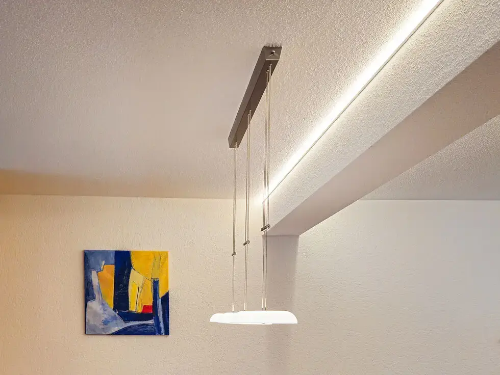 Die Wand, welche das ehemalige Büro vom Wohnzimmer trennte, wurde herausgebrochen. Dadurch erscheint der Wohnraum offener, heller und zudem grösser. Die grösseren Fenster lassen nun auch mehr Licht in die kleine aber gemütliche Wohnung. Das Wohnzimmer wird nur mit zwei Stützbalken zum Esszimmer abgegrenzt. Dadurch wird der Bereich zu jeder Tageszeit mit Licht erhellt.