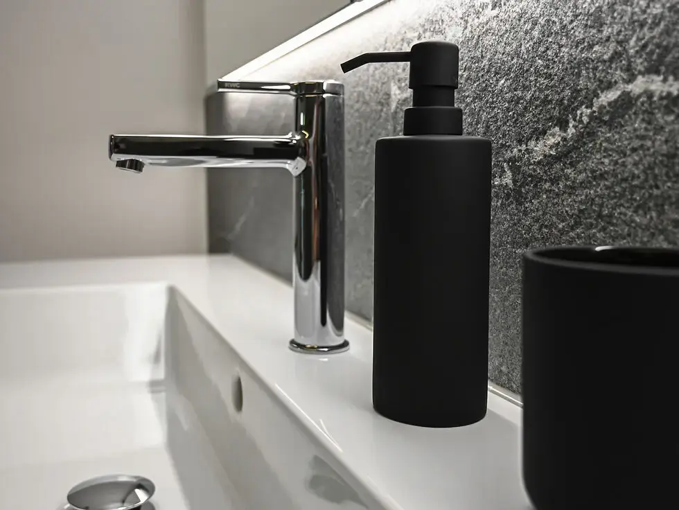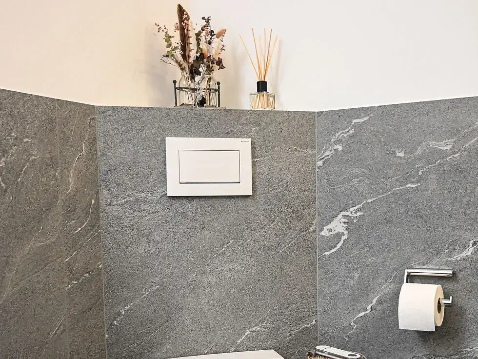 Bei diesem Objekt in Burgdorf durften wir ein Badezimmer vollständig sanieren und ihm einen frischen Charakter verleihen. Die Kombination aus kräftig grünen Wänden und einem markanten Plattenboden in Natursteinoptik verleiht dem Raum eine besondere Ausstrahlung. Zeitlose Sanitärelemente, klare Linien und kleine Akzente wie goldene Spiegelrahmen und dezente Dekoration runden das stilvolle Gesamtbild ab.