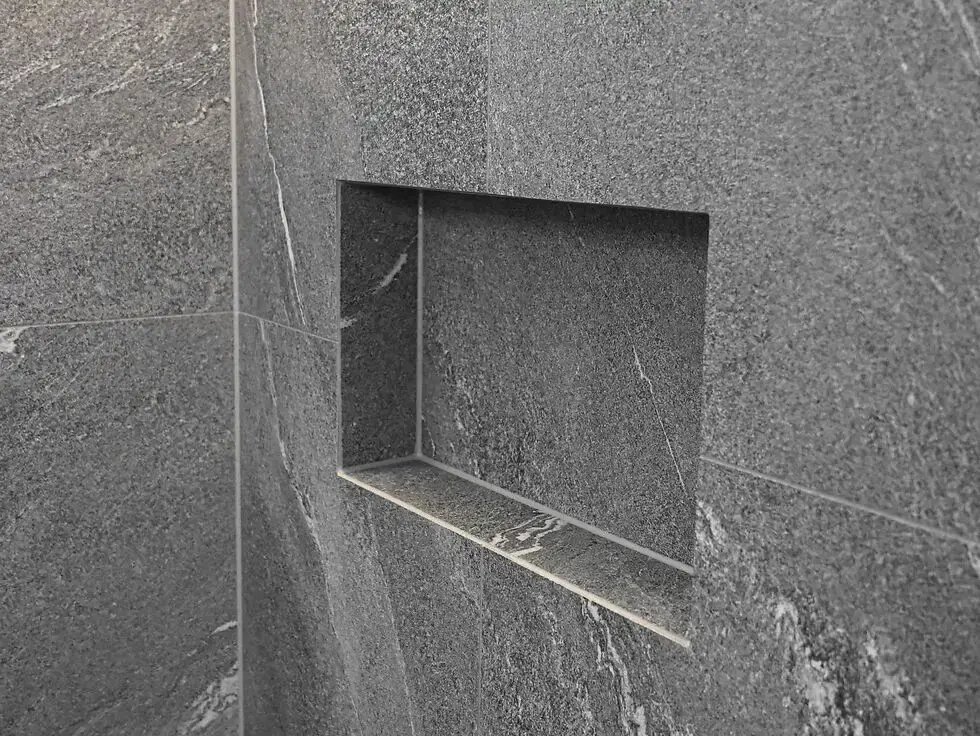 Auch das Bad wurde komplett erneuert: Grossformatig, graue Fliesen, eine reduzierte Formensprache und Elemente in Holzoptik schaffen ein ruhiges, elegantes Ambiente. Die Sanierung überzeugt durch klare Linien, natürliche Materialien und funktionale Gestaltung auf hohem Niveau.