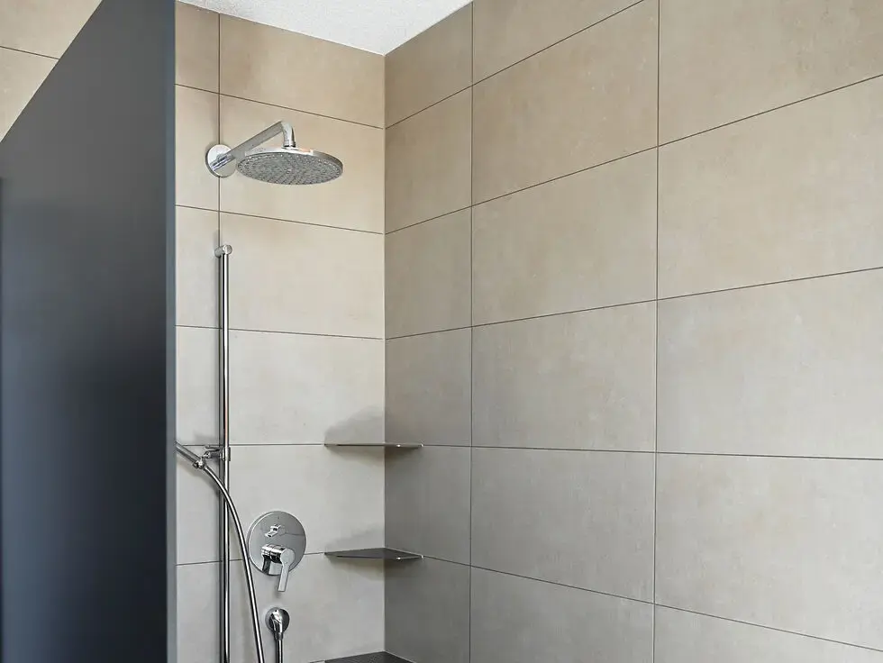 Das Badezimmer ist mit grossformatigen Natursteinfliesen in warmen Beigetönen ausgestattet. Die bodengleiche Dusche verfügt über eine Regendusche sowie eine Handbrause. Die Waschtischanlage mit Holzfronten bietet viel Stauraum. Ein grosser Spiegel mit integrierter Beleuchtung sorgt für gute Lichtverhältnisse.